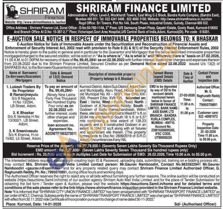 Kurnool District, Adoni Sub District, Adoni Town and Municipality, Aluru Road, House bearing old Municipal No. XII-503/1, new D.No.XIX-205, Present D.No. XVII-735, bounded on: East: Vanka; West: Public Road, North: Godown of K.Narasimha Reddy; South: Godown of Gattu Ramachandraiah. Within these, site admeasuring East to West 67 1/4 ft. or 20.84 mts and North to South 18 1/2 ft. or 5.37 mts comprising a total extent of 138.23 sq.yards and in it constructed Godown in an extent of 1244.12 sq.ft along with all fixtures and appurtenant site therein. (This property corresponds to Doc. No: 2839/2019 of S.R.O
