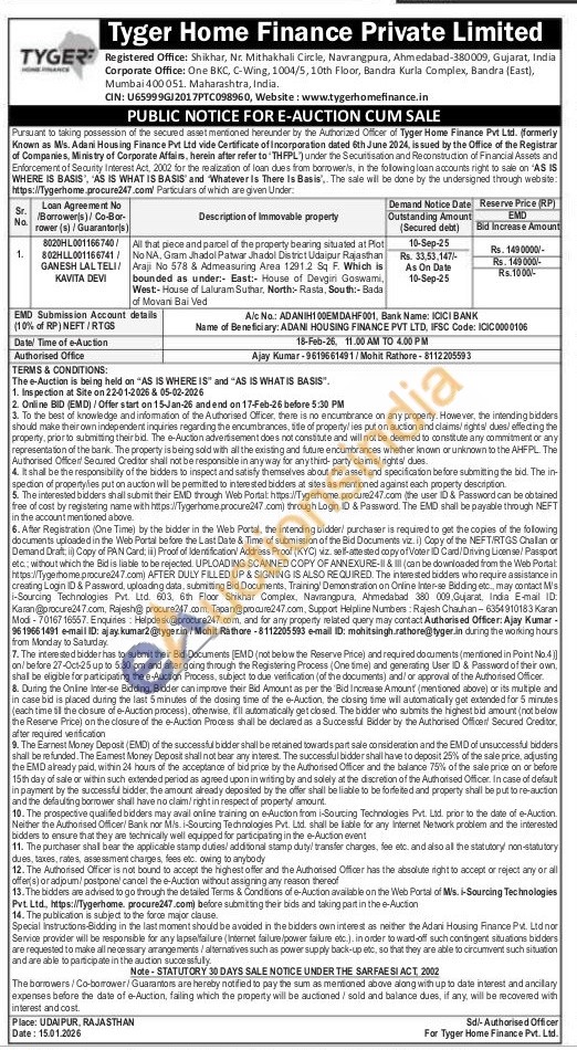 All that piece and parcel of the property bearing situated at Pilot No NA, Gram Jhadol Patwar Jhadol District Udaipur Rajasthan Araji No 578 & Admeasuring Area 1291.2 Sq F. Which is bounded as under: East: House of Devgiri Goswami, West-House of Laluram Suthar, North: Rasta, South:- Bada of Movani Bai Ved