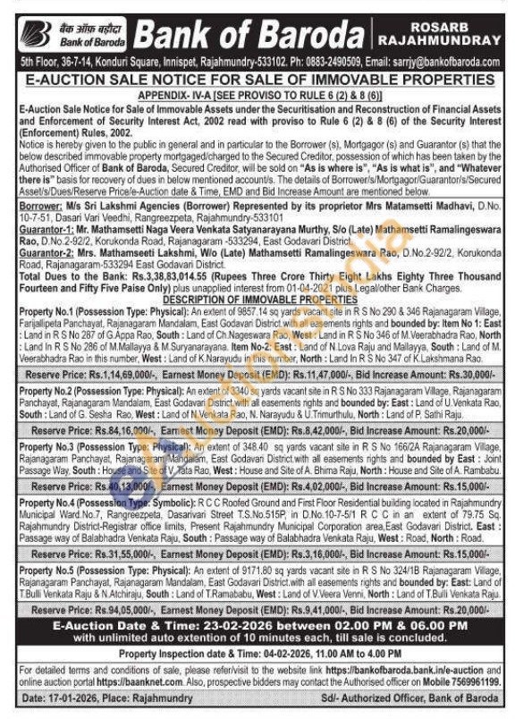 Property No.4 (Possession Type: Symbolic): RCC Roofed Ground and First Floor Residential building located in Rajahmundry Municipal Ward No.7, Rangreezpeta, Dasarivari Street T.S.No.515P, in D.No. 10-7-5/1 RCC in an extent of 79.75 Sq. Rajahmundry District-Registrar office limits, Present Rajahmundry Municipal Corporation area, East Godavari District. East: Passage way of Balabhadra Venkata Raju, South: Passage way of Balabhadra Venkata Raju, West: Road, North: Road