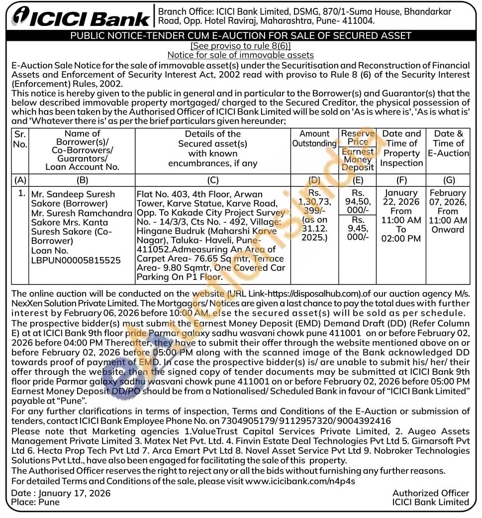 Flat No. 403, 4th Floor, Arwan Tower, Karve Statue, Karve Road, Opp. To Kakade City Project Survey No. 14/3/3, Cts No. - 492, Village: Hingane Budruk (Maharshi Karve Nagar), Taluka- Haveli, Pune411052.Admeasuring An Area of Carpet Area-76.65 Sq mtr, Terrace Area-9.80 Sqmtr, One Covered Car Parking On P1 Floor