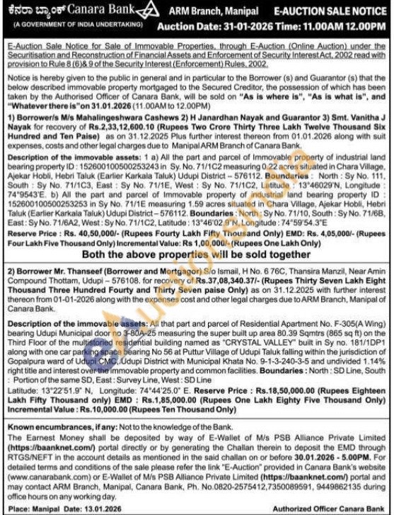 Description of the immovable assets: All that part and parcel of Residential Apartment No. F-305(A Wing) bearing Udupi Municipal door no 3-80A-25 measuring the super built up area 80.39 Sqmtrs (865 sq ft) on the Third Floor of the multistoried residential building named as "CRYSTAL VALLEY built in Sy no. 181/1DP1 along with one car parking space bearing No 56 at Puttur Village of Udupi Taluk falling within the jurisdiction of Gopalpura ward of Udupi CMC, Udupi District with Municipal Khata No. 9-1-3-240-3-5 and undivided 1.14% right title and interest over the immovable property and common facilities. Boundaries: North: SD Line, South Portion of the same SD, East: Survey Line, West: SD Line