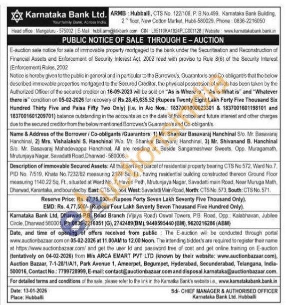Description of immovable Secured Assets: All that part and parcel of residential property bearing CTS No 572. Ward No.7. PID No. 7/519, Khata No. 7232/62 measuring 2124 Sq. Ft, having residential building constructed thereon Ground Floor measuring 1140.22 Sq. Ft., situated at Ward No. 7, Haveri Peth, Mrutunjaya Nagar, Savadatti main Road, Near Muruga Math Dharwad, Karantaka, and bounded by: East: CTS No. 564, West: Savadatti Main Road, North: CTS No. 573, South: CTS No.571