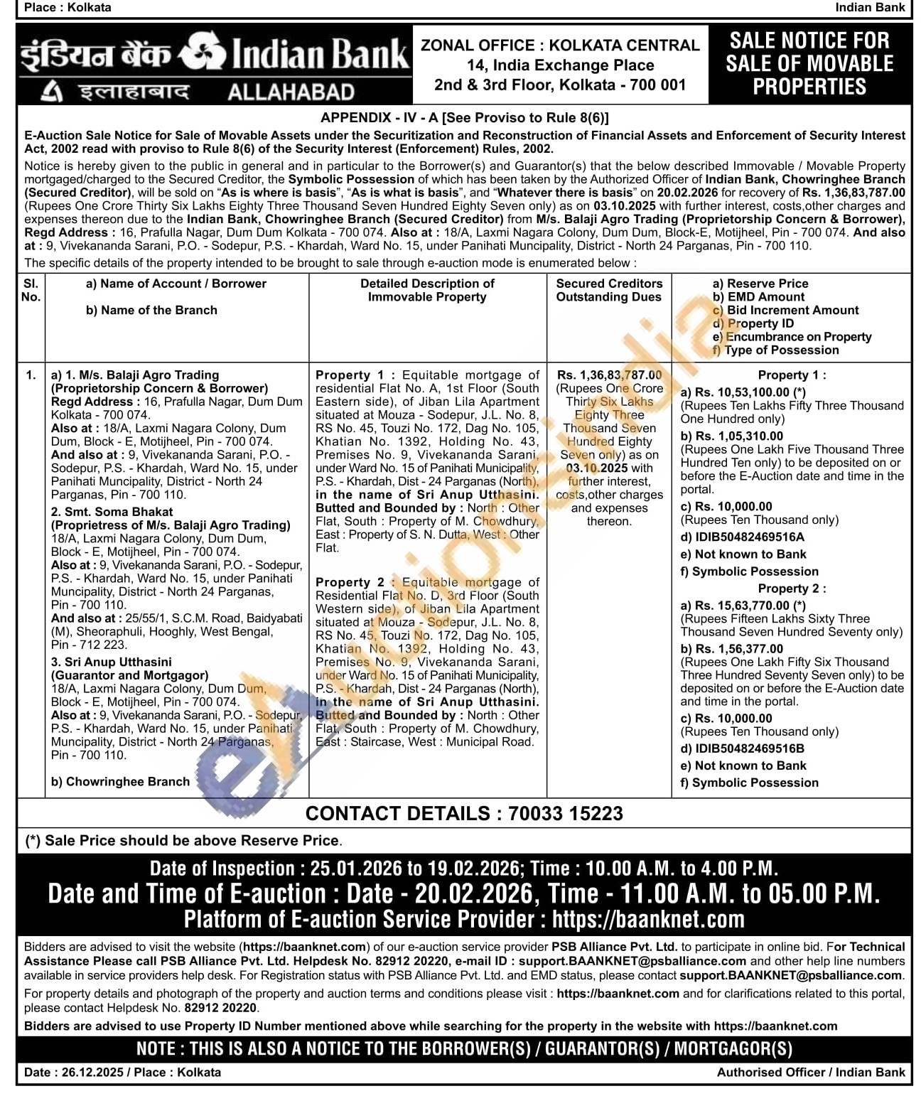 Property 2: Equitable mortgage of Residential Flat No. D, 3rd Floor (South Western side), of Jiban Lila Apartment situated at Mouza - Sodepur, J.L. No. 8, RS No. 45, Touzi No. 172, Dag No. 105, Khatian No. 1392, Holding No. 43, Premises No. 9, Vivekananda Sarani, under Ward No. 15 of Panihati Municipality, P.S. Khardah, Dist-24 Parganas (North), in the name of Sri Anup Utthasini. Butted and Bounded by: North: Other Flat, South Property of M. Chowdhury, East: Staircase, West: Municipal Road.