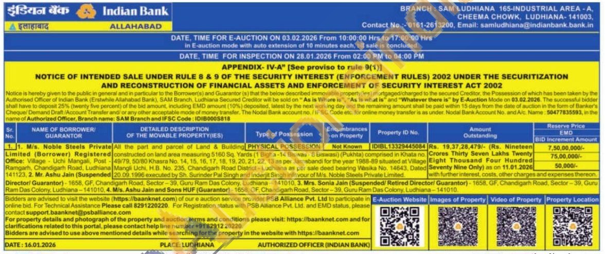 All the part and parcel of Land & Building Registered constructed on land area measuring 5160 Sq. Yards (1 Bigha-14 Biswas - 8 Biswasi) (Pukhta) comprised in Khata no Post-49/79, 50/80 Khasra No. 14, 15, 16, 17, 18, 19, 20, 21, 22, 13 as per Jamabandi for the year 1988-89 situated at Village Ludhiana Mangli Uchi, H.B. No. 235. Chandigarh Road District-Ludhiana as per sale deed bearing Wasika No. 14643, Dated 20.09.1996 executed by Sh. Surinder Pal Singh and Inderjit Singh infavour of Mis. Noble Steels Private Limited