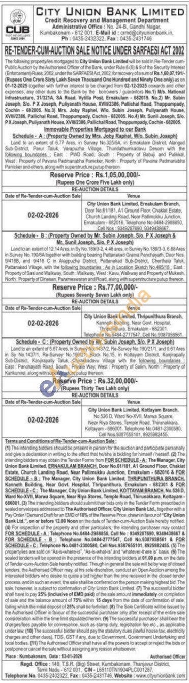 Land to an extent of 12.14 Ares, in Sy No. 1893-2, 4.46 ares, in Survey No. 1893-3.6.88Ares in Survey No 1905A together with building bearing Pattanakad Grama Panchayath, Door Nos 94188, and 9418 C in Alappuzha District, Pattanaka Sub-District, Cherthala Taluk Pattanakad Village, with the following boundaries. As in Location Sketch No.465:18 East: Property of Sasi and Walkway South Walkway, West: Kavu, Walkway and Property of Mukesh North Property of Dinesan, Parameswaran and Road, along with superstructure putup thereon