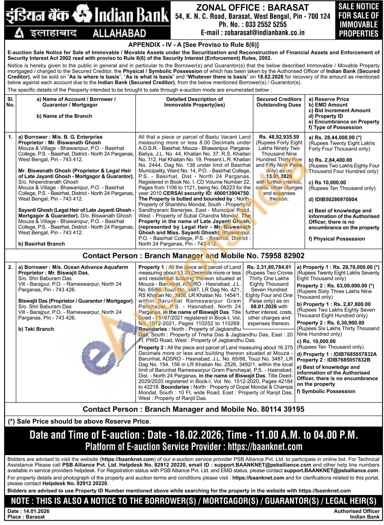 All that a piece or parcel of Bastu Vacant Land measuring more or less 8.00 Decimals under A.D.S.R.-Basirhat, Mouza-Bhawanipur, Pargana-Baliya, J.L. No. 44, Khatian No. 37, R.S. Khaitan No. 112, Hal Khatian No. 19, Present L.R. Khatian No. 2444, Dag No. 138 under limit of Basirhat Municipality, Ward No. 14, P.O. Basirhat College, P.S. Basirhat, Dist North 24 Parganas. Registered in Book No. 1, CD Volume Number 22, Pages from 1106 to 1121, being No. 06223 for the year 2010.CERSAI security ID: 400013904750. The Property is butted and bounded by: North-Property of Shambhu Mondal, South - Property of Sandhyarani Banerjee, East Municipal Road, West Property of Subal Chandra Mondal. The Property in the name of Late Jayanti Ghosh, (represented by Legal Heir Mr. Biswanath Ghosh and Miss. Sayanti Ghosh), Bhawanipur, P.O. Basirhat College, P.S. Basirhat, District: North 24 Parganas, Pin-743 412.
