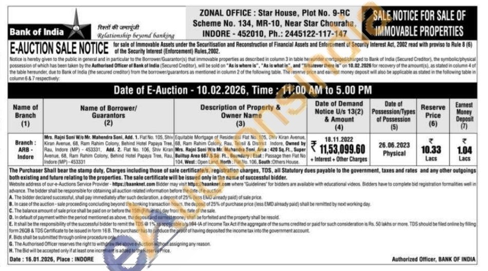 Equitable Mortgage of Residential Flat No. 105. Shiv Kiran Avenue, Kiran Avenue. 68. Ram Rahim Colony, Behind Hotel Papaya Tree, 68, Ram Rahim Colony, Rau. Tehsil & District Indore, Owned by Rau, Indore (MP)-453331.