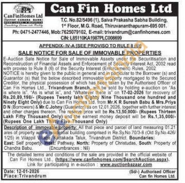 Description of immovable property, All that piece and parcel of land measuring 01.21 ares of property with a residential building comprised in Re.Sy. No 70/3-8 (Old Sy No.426/1/25) in Vilappil Village, Kattakada Taluk, Trivandrum District. Boundaries: East: Self property, West: Pathway, North: Property of Christudas, South Property