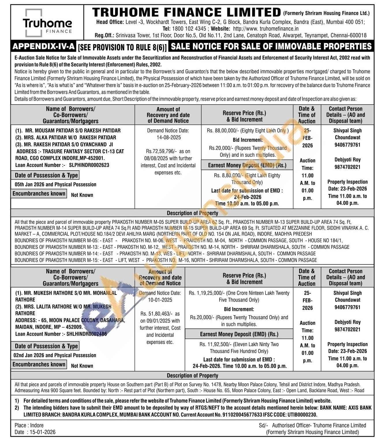 All that the piece and parcel of immovable property PRAKOSTH NUMBER M-05 SUPER BUILD-UP AREA 62 Sq. Ft., PRAKOSTH NUMBER M-13 SUPER BUILD-UP AREA 74 Sq. Ft. PRAKOSTH NUMBER M-14 SUPER BUILD-UP AREA 74 Sq. Ft AND PRAKOSTH NUMBER M-15 SUPER BUILD-UP AREA 69 Sq. Ft. SITUATED AT MEZZANINE FLOOR, SIDDHI VINAYAK A. C. MARKETA, COMMERCIAL PLOT/HOUSE NO.184/2 DEVI AHILIYA MARG (NORTHERN PART OF OLD NO. 154 ON JAIL ROAD), INDORE, MADHYA PREDESH