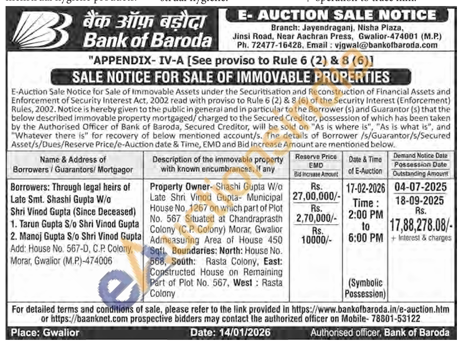 Property Owner- Shashi Gupta W/o Late Shri Vinod Gupta- Municipal House No. 1267 on which part of Plot No. 567 Situated at Chandraprasth Colony (C.P. Colony) Morar, Gwalior Admeasuring Area of House 450 Sqft. Boundaries: North: House No. 568, South: Rasta Colony, East: Constructed House on Remaining Part of Plot No. 567, West: Rasta Colony