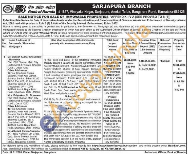 All that piece and parcel of the residential immovable property bearing a vacant site bearing Corporation Khata No.426/715/8/540/2/31/2, No 826/715/A/540/1/31/1 and No. 32/715/540/31 situated at Kote, Kengeri, Bengaluru Kengeri Sub-Division, measuring approximately 16300 Sq ft and including all rights, privileges and appurtenances thereto and measuring: East to West: A to H-89 feet. B to C-25 feet, D to E-72.7 feet, F to G-39 feet, North to South: A to 8-92 feet C to D-92.11 feet, E to F-110.10 feet, G to H-77 feet Bounded as Follows: North Road, South: Road, East: Road leading to Vrushbhavathi River, West Road and private property436.89 Sq Ft of undivided share, right and interest in the Schedule 'A' property hereby conveyed by the vendor to the purchaserAll that piece and parcel of the residential Apartment bearing No. A-302 in the third floor of the project known as RF TWILIGHT built on schedule A property and apartment measuring 1500.85 sq ft of super built up area and proportionate share in common areas such as passages, lobbies, lifts, staircases, and other areas of common use inclusive of balcony and utility areas with One car parking space in the basement floor and includes right privileges, appurtenances therto and Bounded on: North: Sedback area, South: Flat A-301, East Fiat A-303, West: Selback area The immovable security is in the name of Mr. Mukesh Kumar Choudhary and Mrs. Priyanka