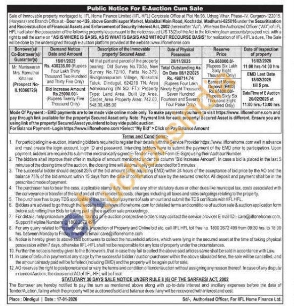 All that part and parcel of the property bearing: Old Survey No. 70/30, Nirw Survey No.72/10, Patta No.379. Sivagnanapuram Village, Nilakottai Tatux, Dindagul, 624219 TN Area Admeasuring (IN SQ FT) Property Type: Land Area, Built Up Area. Carpet Area Property Area: 742.00, 548.00,465.00