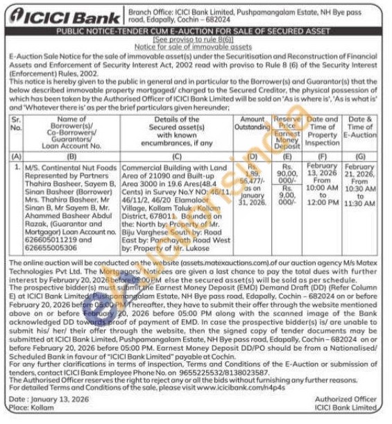 Commercial Building with Land Area of 21090 and Built-up Area 3000 in 19.6 Ares (48.4 Cents) in Survey No.Y NO: 46/11, 46/11/2, 46/20 Elamaloor Village, Kollam Taluk, Kollam District, 678011. Bounded on the: North by: Property of Mr. Biju Varghese South by: Road East by: Panchayath Road West by: Property of Mr. Lukose