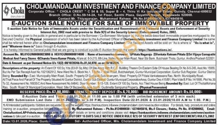 Descriptions of the property: An Extent Of 100 Sq. Yds (83-61 Sq.Mts) Of Site Along With R.C.C. Building Therein On Eastem Side Of House Bearing Dr. No.8-5-245, Asst. No. 15955, But As Per Tax Receipt Asst No. 1021062912, New Ward No. 5. Block No. 1, T.S.No. 7, Main Road, Butchaiahpet, Guntur Municipal Corporation, Guntur Sub Register, Guntur District Being Bounded By:-East: Municipality Main Road, South: Property Of Gudapati Subramanyam, West: Property Of Pittala Vankateswara Rao, North: Municipality Road. All That Piece And Parcel Of The Property Situated At Guntur District, Guntur Sub District, Guntur Municipal CorporationArea, Guntur Dno.415/B1, Plan Vide B.P.No. 14/1995, Plot No.30 To 32. Assessment No. 16935/C And New Assessment No 64840, Door Number: 8-13-128, Extent Of 100 Sq. Yards, Acc Tiled House Being Bounded By: East: Lot Of Thotta Mohana Rao, South Road Of Municipal Corporation, West Site Of Bezawada Jaya, North: Gudimetla Sampuma Property. (Physical Possession)