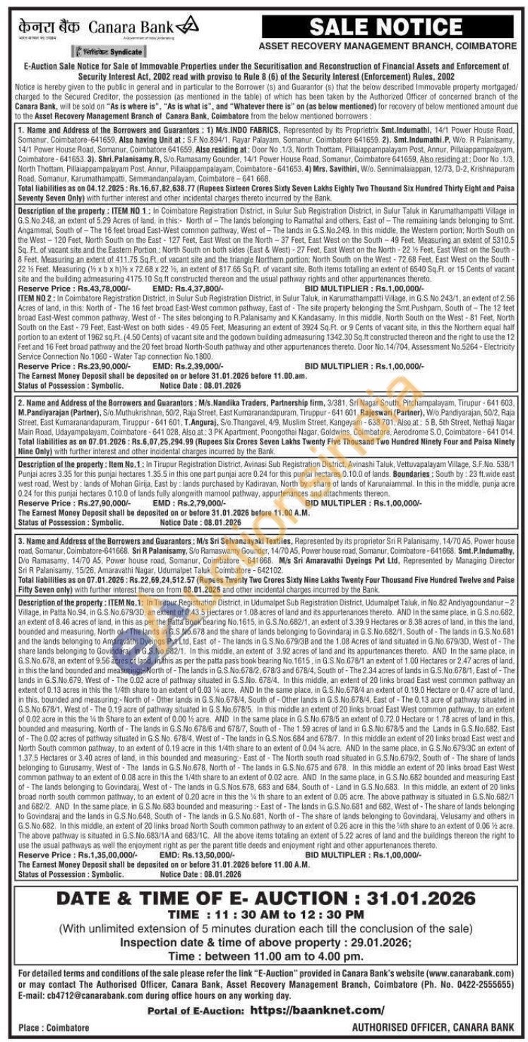 In Tirupur Registration District, in Udumalpet Sub Registration District. Udumalpet Taluk, in No. 82 Andiyagoundanur-2 Village, in Patta No.94, in G.S.No.679/3D, an extent of 0.43.5 Hectares or 1.08 acres of land and its appurtenances thereto. AND In the same place, in G.S.no.682. an extent of 8.46 acres of land, in this as per the Patta Book bearing No. 1615, in G.S.No.682/1, an extent of 3.39.9 Hectares or 8.38 acres of land, in this the land. bounded and measuring, North of The lands in G.S.No.678 and the share of lands belonging to Govindaraj in G.S.No.682/1, South of The lands in G.S.No.681 and the lands belonging to Amaravathi Dyeings Pvt Ltd, East of The lands in G.S. No.679/3B and the 1.08 Acres of land situated in G.No.679/3D, West of The share lands belonging to Govindaraj in G.S.No.682/1. In this middle, an extent of 3.92 acres of land and its appurtenances thereto. AND In the same place, in G.S.No.678, an extent of 9.56 acres of land, in this as per the patta pass book bearing No. 1615, in G.S.No.678/1 an extent of 1.00 Hectares or 2.47 acres of land. in this the land bounded and measuring:-North of The lands in G.S.No. 678/2, 678/3 and 678/4, South of - The 2.34 acres of lands in G.S.No.678/1, East of The lands in G.S.No.679. West of - The 0.02 acre of pathway situated in G.S.No. 678/4. In this middle, an extent of 20 links broad East west common pathway an extent of 0.13 acres in this the 1/4th share to an extent of 0.03% acre. AND In the same place, in G.S.No.678/4 an extent of 0.19.0 Hectare or 0.47 acre of land, in this, bounded and measuring - North of Other lands in G. S.No.678/4, South of Other lands in G.S.No.678/4, East of The 0.13 acre of pathway situated in G.S.No.678/1, West of The 0.19 acre of pathway situated in G.S.No.678/5. In this middle an extent of 20 links broad East West common pathway, to an extent of 0.02 acre in this the ½ th Share to an extent of 0.00% acre. AND In the same place in G.S.No.678/5 an extent of 0.72.0 Hectare or 1.78 acres of land in this. bounded and measuring. North of The lands in G.S.No.678/6 and 678/7, South of The 1.59 acres of land in G.S.No. 678/5 and the Lands in G.S.No.682, East of-The 0.02 acres of pathway situated in G.S.No. 678/4, West of The lands in G.S.Nos.684 and 678/7. In this middle an extent of 20 links broad East west and North South common pathway, to an extent of 0.19 acre in this 1/4th share to an extent of 0.04 % acre. AND In the same place, in G.S.No.679/30 an extent of 1.37.5 Hectares or 3.40 acres of land, in this bounded and measuring:- East of The North south road situated in G.S.No.679/2, South of The share of lands belonging to Gurusamy, West of The lands in G.S.No.678, North of The lands in G.S.No.675 and 678. In this middle an extent of 20 links broad East West common pathway to an extent of 0.08 acre in this the 1/4th share to an extent of 0.02 acre. AND In the same place, in G.S.No.682 bounded and measuring East of-The lands belonging to Govindaraj, West of The lands in G.S. Nos 678, 683 and 684, South of Land in G.S.No.683. In this middle, an extent of 20 links broad north south common pathway, to an extent of 0.20 acre in this the 14 th share to an extent of 0.05 acre. The above pathway is situated in G.S.No.682/1 and 682/2. AND In the same place, in G.S.No 683 bounded and measuring-East of The lands in G.S.No.681 and 682, West of The share of lands belonging to Govindaraj and the lands in G.S.No.648, South of The lands in G.S.No.681, North of The share of lands belonging to Govindaraj, Velusamy and others in G.S.No.682. In this middle, an extent of 20 links broad North South common pathway to an extent of 0.26 acre in this the 4th share to an extent of 0.06½ acre The above pathway is situated in G.S. No.683/1A and 683/1C. All the above items totaling an extent of 5.22 acres of land and the buildings thereon the right to use the usual pathways as well the enjoyment right as per the parent title deeds and enjoyment right and other appurtenances thereto.