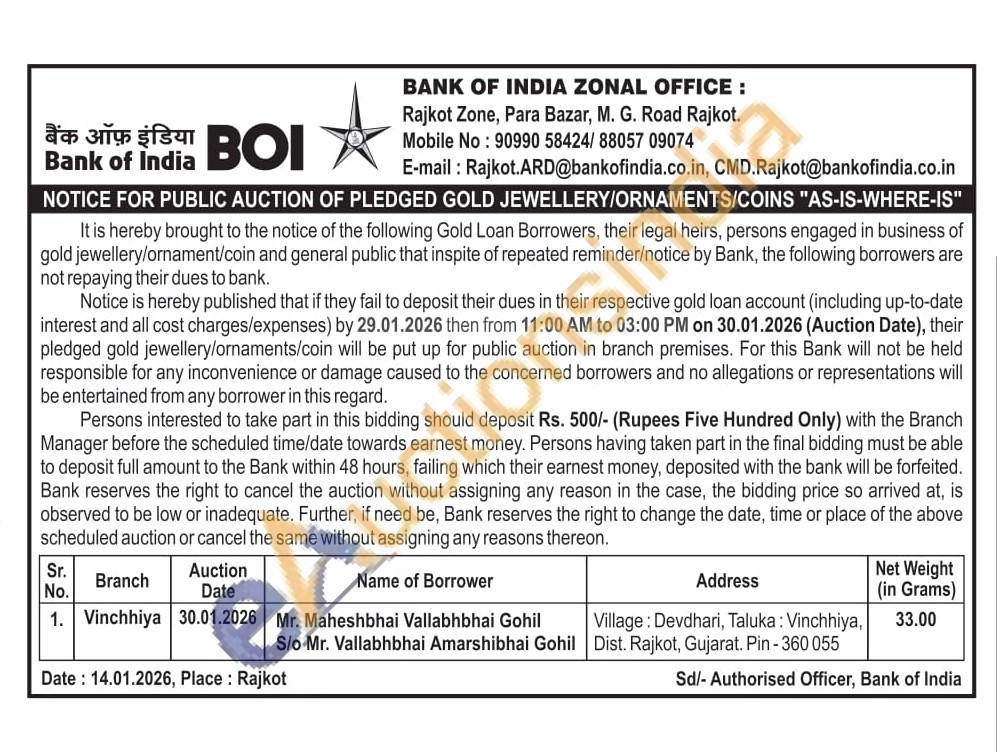 Bank of India Gold Auctions Auction in Rajkot