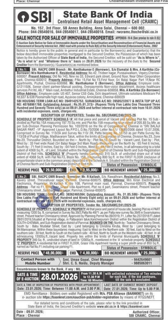 SCHEDULE OF PROPERTY: SCHEDULE 'A' PROPERTY All that piece and parcel of house site, bearing Plot no 4 PART measuring 1200 Sq. ft, comprised in Survey No.39/2 Patta No 4971 as per Patta new survey No 39/8 in Swarmykannu street, Present teacher Chinnasamy street, Approved by Planning Permit No. 09/2019, F1, Letter No.237/2018 F1,dated 28/01/2019,Situated at Pammal village, in Pallavaram taluk, Kancheepuram Destrict within the Registration District of SOUTH-CHENNAI, and Sub-Registration district of Pammal. BOUNDED ON THE: North by: Teacher Chinnasamy Street, South by Babu Mudalar Street, East by Land belonging to Christina Kiriba, West by Land belonging to Mr.Manivannan, Within these boundaries measuring: East to West on the Northern side: 30 feet, East to West on the southern side: 30 feet, North to South on the Eastern side: 40 feet, North to South on the Westem side: 40 feet, in all admeasuring 1200Sq.ft., Vacant land. Property lies within the limits of Pammal Municipality SCHEDULE '8' PROPERTY 340 Sq. ft, undivided share of land in 1200Sq.ft, mentioned in the A schedule property