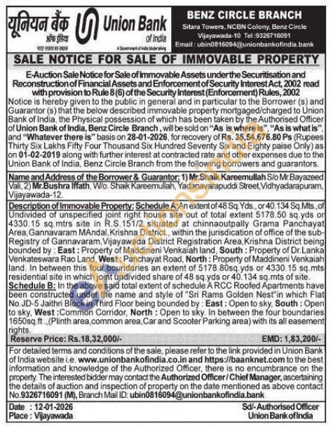 Description of Immovable Property: Schedule A:An extent of 48 Sq. Yds,, or 40. 134 Sq.Mts., of Undivided of unspecified joint right house site out of total extent 5178.50 sq.yds or 4330.15 sq.mtrs site in R.S. 151/2 situated at chinnaoutpally Grama Panchayat Area, Gannavaram Mandal, Krishna District., within the jurisdication of office of the sub-Registry of Gannavaram, Vijayawada District Registration Area, Krishna District being bounded by: East: Property of Maddineni Venkaiah land, South: Property of Dr. Lanka Venkateswara Rao Land, West: Panchayat Road, North: Property of Maddineni Venkaiah land. In between this four boundaries an extent of 5178.80sq. yds or 4330.15 sq.mts residential site in which joint undivided share of 48 sq yds or 40.134 sq.mts of site. been constructed under the name and style of "Sri Rams Golden Nest'in which Fiat No. JD-5 Jaithri Block in Third Floor being bounded by: East: Open to sky, South: Open to sky, West: Common Corridor, North: Open to sky. In between the four boundaries 1650sq.ft., (Plinth area, common area, Car and Scooter Parking area) with its all easement Schedule B: In the above said total extent of schedule A RCC Roofed Apartments have rights.