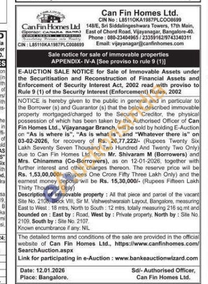All that piece and parcel of the vacant Site No. 2108, Block VIII, Sir M. Vishweshwaraiah Layout, Bangalore, measuring East to West: 18 mtrs, North to South 12 mirs, totally measuring 216 sq.mt and bounded on: East by: Road, West by: Private property, North by: Site No. 2109, South by: Site No. 2107.