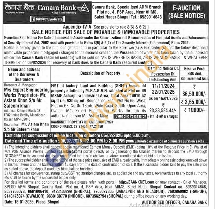 EMT of factory Land and Building (SHED) leasehold property allotted by M.P.A.K.V.N. siluated at Plot no.66 MSME Acharpura Industrial Area, Total Area 10010.52 sq.ft i.e. 930 sq.mt.