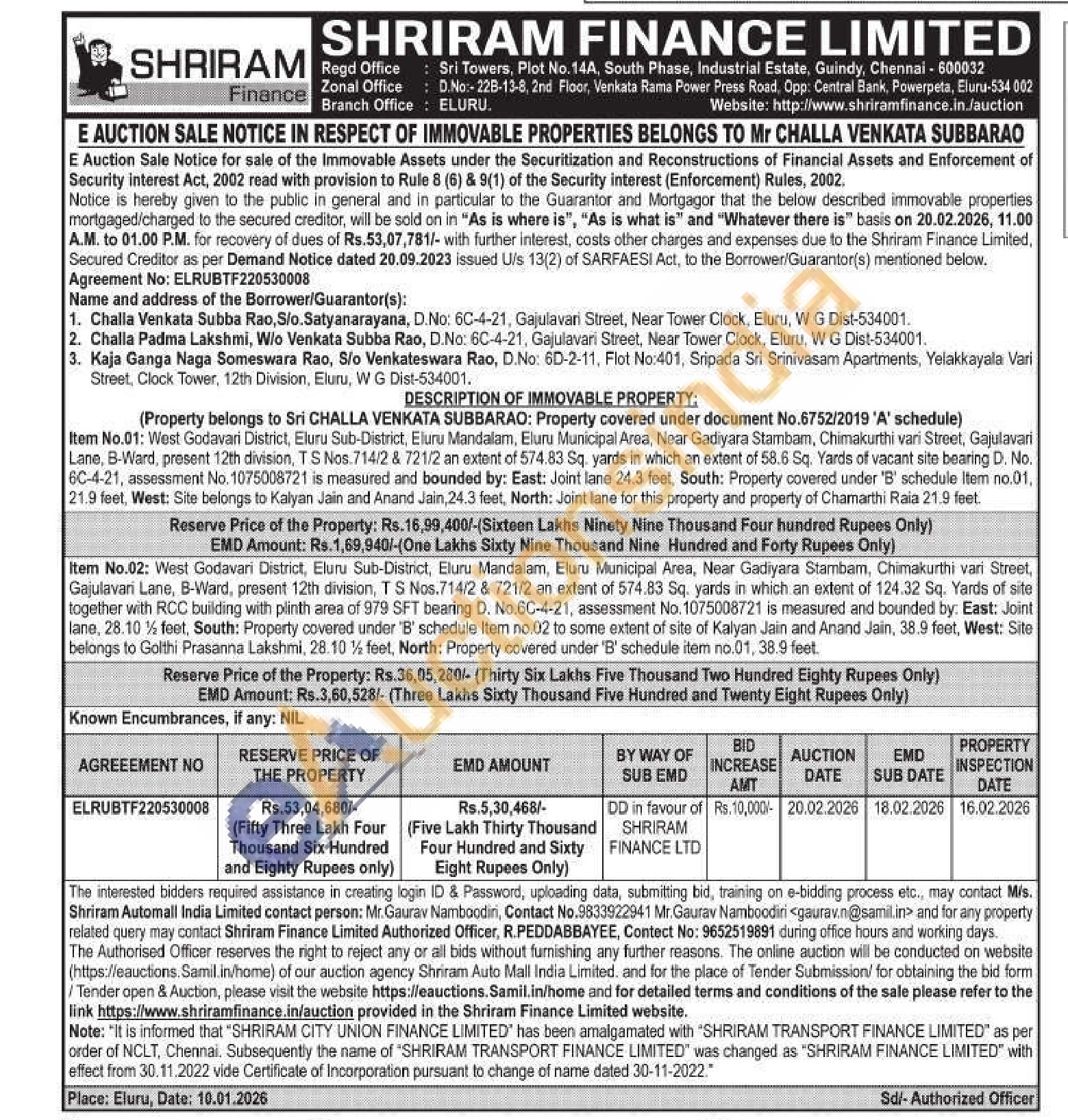 Item No.02: West Godavari District, Eluru Sub-District, Eluru Mandalam, Eluru Municipal Area, Near Gadiyara Stambam, Chimakurthi vari Street, Gajulavari Lane, B-Ward, present 12th division, T S Nos.714/2 & 721/2 an extent of 574.83 Sq. yards in which an extent of 124.32 Sq. Yards of site together with RCC building with plinth area of 979 SFT bearing D. No.6C-4-21, assessment No. 1075008721 is measured and bounded by: East: Joint lane, 28.10% feet, South: Property covered under "B' schedule Item no.02 to some extent of site of Kalyan Jain and Anand Jain, 38.9 feet, West: Site belongs to Golthi Prasanna Lakshmi, 28.10½ feet, North: Property covered under 'B' schedule item no.01, 38.9 feet