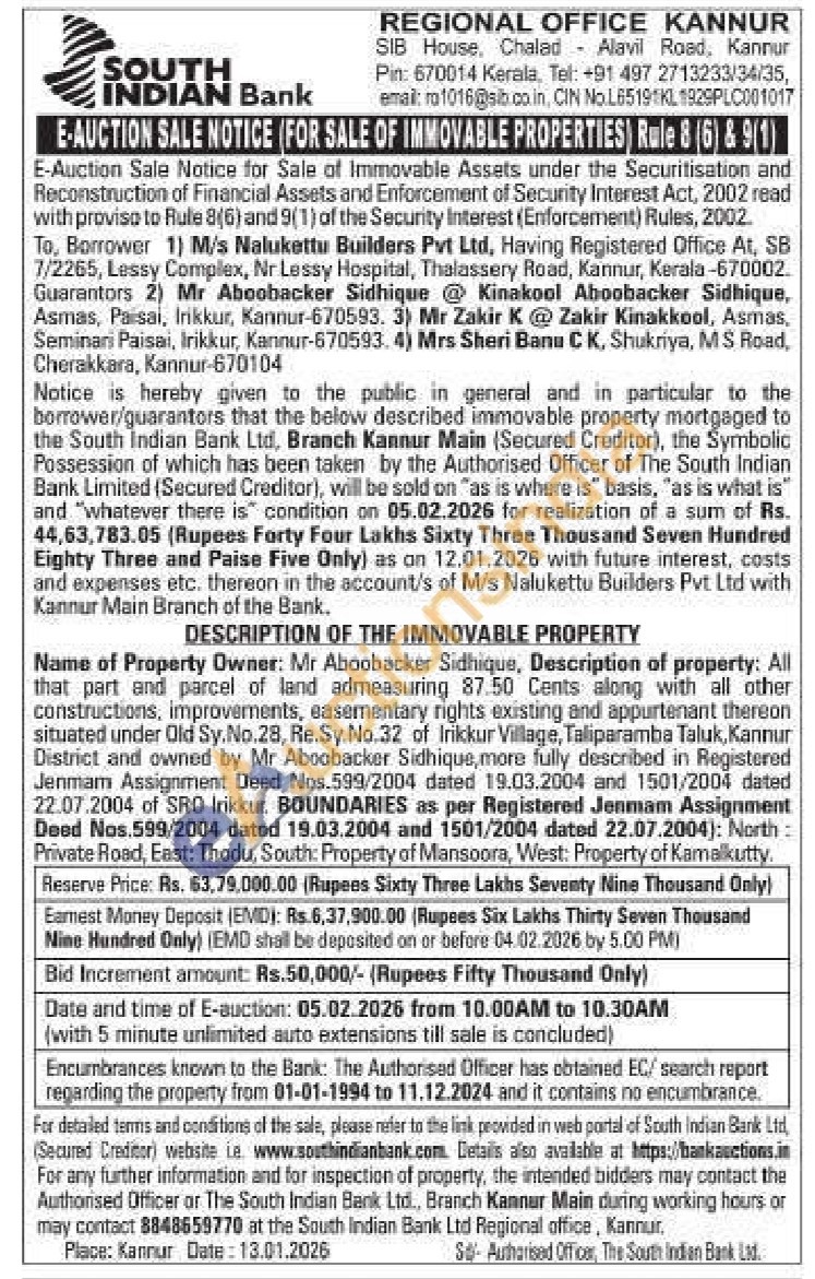Name of Property Owner: Mr Aboobacker Sidhique, Description of property: All that part and parcel of land admeasuring 87.50 Cents along with all other constructions, improvements, easementary rights existing and appurtenant thereon situated under Old Sy. No.28, Re.Sy.No.32 of Irikkur Village, Taliparamba Taluk, Kannur District and owned by Mr Mr Aboobacker Sidhique, more fully described in Registered Jenmam Assignment Deed Nos.599/2004 dated 19.03.2004 and 1501/2004 dated 22.07.2004 of SRO Irikkur. BOUNDARIES as per Registered Jenmam Assignment Deed Nos.599/2004 dated 19.03.2004 and 1501/2004 dated 22.07.2004): North: Private Road, East: Thodu, South: Property of Mansoora, West: Property of Kamalkutty