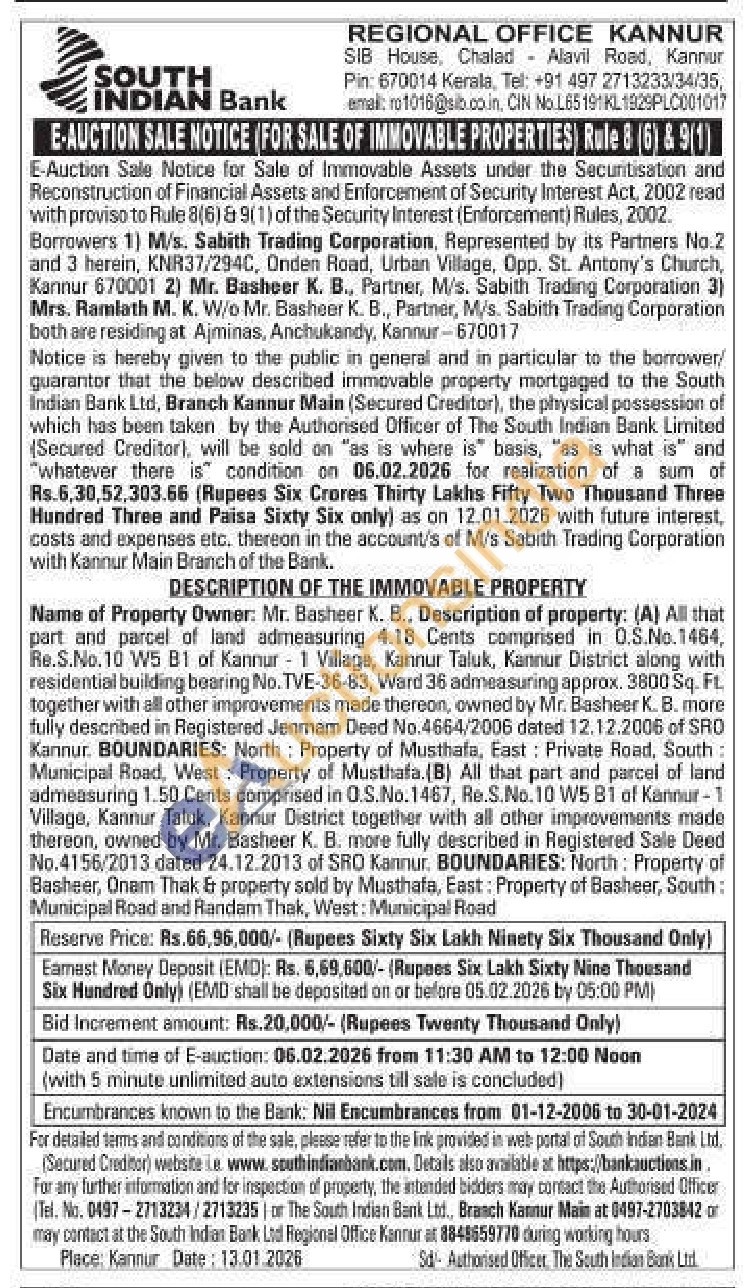 Name of Property Owner: Mr. Basheer K. B., Description of property: (A) All that part and parcel of land admeasuring 4.18 Cents comprised in O.S.No.1464, Re.S.No.10 W5 B1 of Kannur 1 Village, Kannur Taluk, Kannur District along with residential building bearing No.TVE-36-83, Ward 36 admeasuring approx. 3800 Sq. Ft. together with all other improvements made thereon, owned by Mr. Basheer K. B. more fully described in Registered Jenmam Deed No.4664/2006 dated 12.12.2006 of SRO Kannur. BOUNDARIES: North Property of Musthafa, East: Private Road, South: Municipal Road, West: Property of Musthafa. (B) All that part and parcel of land admeasuring 1.50 Cents comprised in O.S.No. 1467, Re.S.No. 10 W5 B1 of Kannur-1 Village, Kannur Taluk, Kannur District together with all other improvements made thereon, owned by Mr. Basheer K. B. more fully described in Registered Sale Deed No.4156/2013 dated 24.12.2013 of SRO Kannur, BOUNDARIES: North: Property of Basheer, Onam Thak & property sold by Musthafa, East: Property of Basheer, South: Municipal Road and Randam Thak, West: Municipal Road