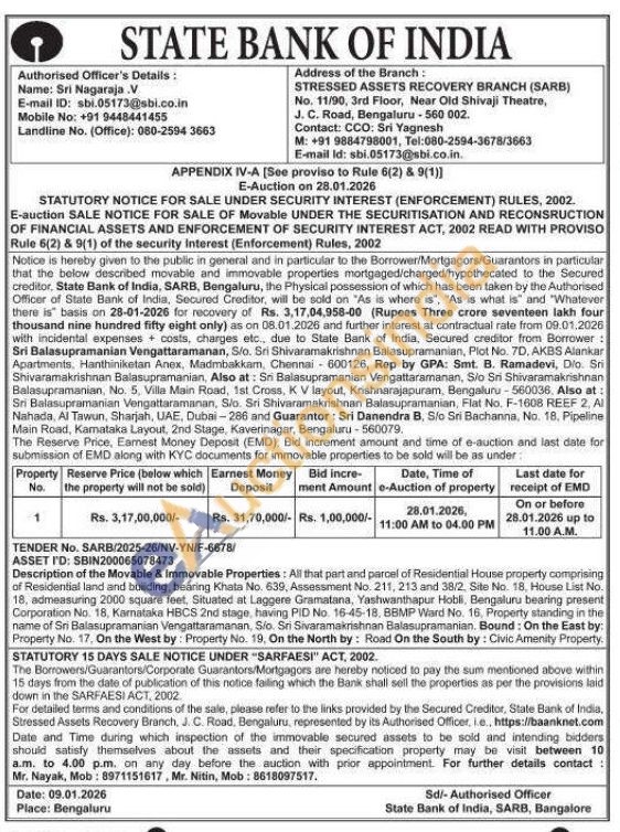 Description of the Movable & Immovable Properties: All that part and parcel of Residential House property comprising of Residential land and building, bearing Khata No. 639, Assessment No. 211, 213 and 38/2, Site No. 18, House List No. 18, admeasuring 2000 square feet, Situated at Laggere Gramatana, Yashwanthapur Hobli, Bengaluru bearing present Corporation No. 18, Karnataka HBCS 2nd stage, having PID No. 16-45-18. BBMP Ward No. 16, Property standing in the name of Sri Balasupramanian Vengattaramanan, Sio. Sri Sivaramakrishnan Balasupramanian. Bound: On the East by: Property No. 17. On the West by: Property No. 19, On the North by: Road On the South by: Civic Amenity Property