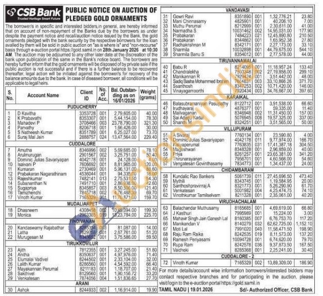CSB Bank Gold Auctions Auction in Puducherry