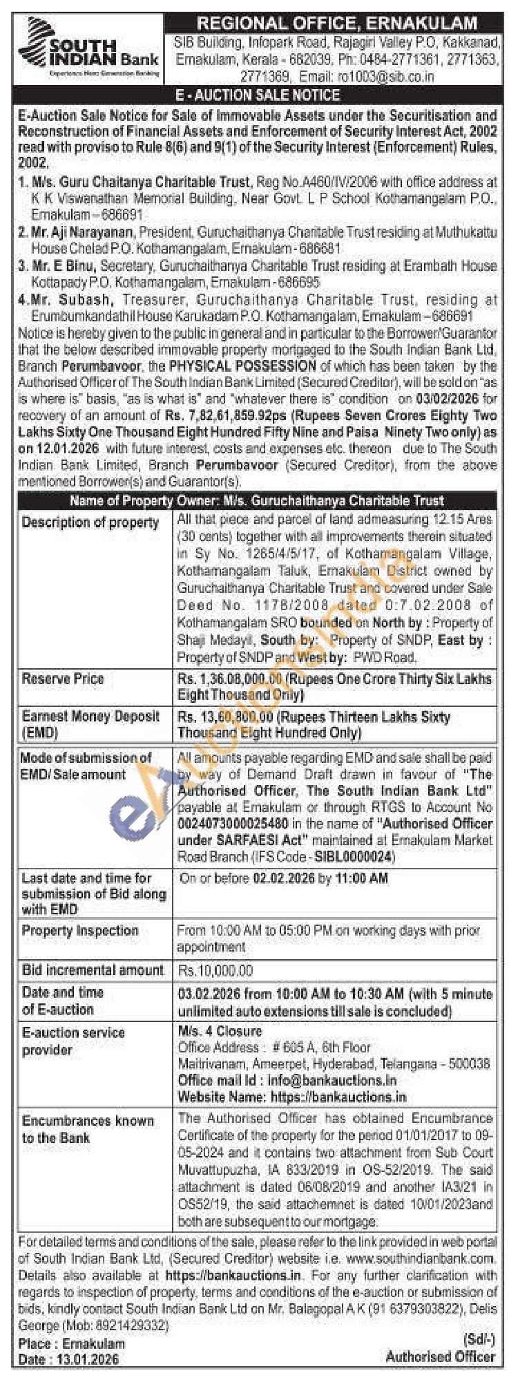 All that piece and parcel of land admeasuring 12.15 Ares (30 cents) together with all improvements therein situated in Sy No. 1265/4/5/17, of Kothamangalam Village, Kothamangalam Taluk, Emakulam District owned by Guruchaithanya Charitable Trust and covered under Sale Deed No. 1178/2008 dated 0:7.02.2008 of Kothamangalam SRO bounded on North by: Property of Shaj Medayil, South by: Property of SNDP, East by: Property of SNDP and West by: PWD Road