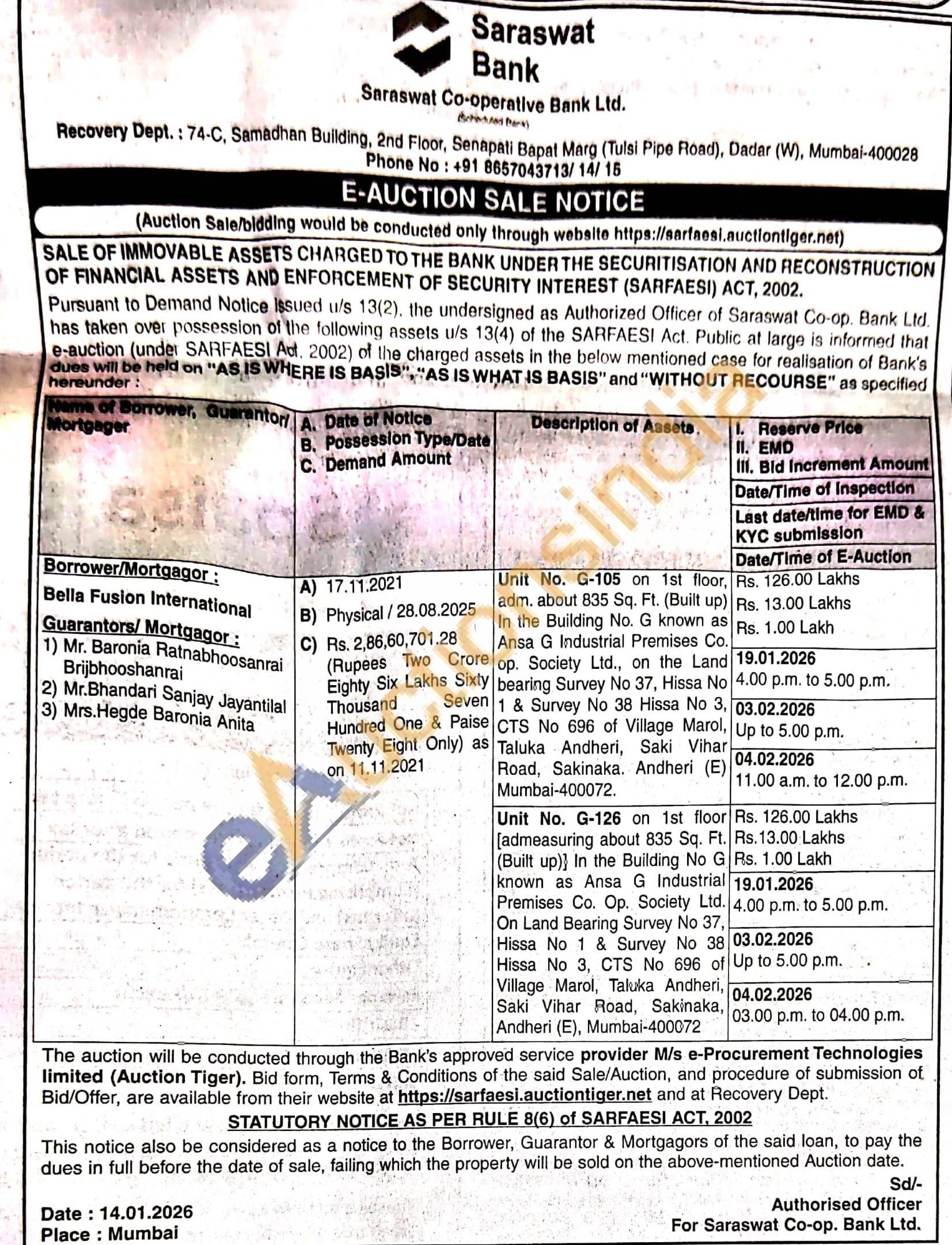 Unit No. G-126 on 1st floor [admeasuring about 835 Sq. Ft. (Built up)] In the Building No G known as Ansa G Industrial Premises Co. Op. Society Ltd. On Land Bearing Survey No 37, Hissa No 1 & Survey No 38 Hissa No 3, CTS No 696 of Village Marol, Takka Andheri, Saki Vihar Road, Sakinaka, Andheri (E), Mumbai-400072
