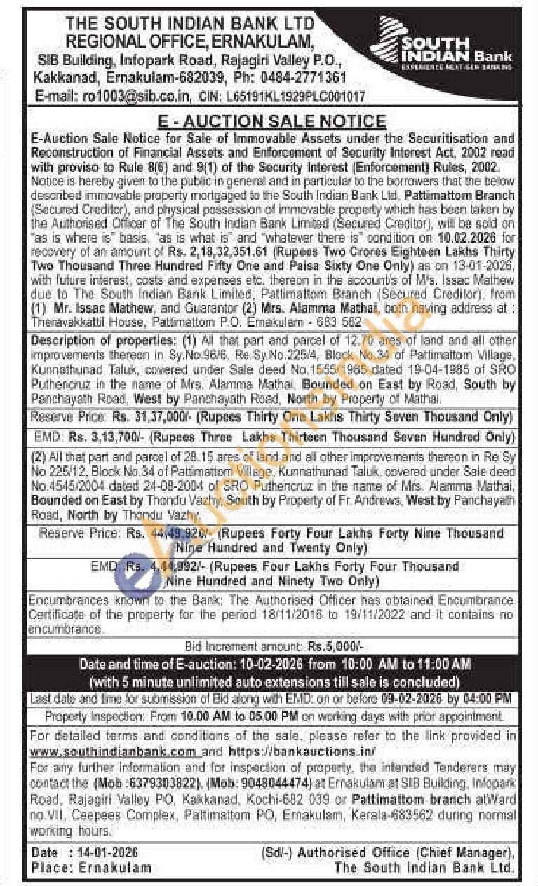 (2) All that part and parcel of 28.15 ares of land and all other improvements thereon in Re Sy No 225/12, Block No.34 of Pattimattom Village, Kunnathunad Taluk, covered under Sale deed No.4545/2004 dated 24-08-2004 of SRO Puthencruz in the name of Mrs. Alamma Mathai, Bounded on East by Thondu Vazhy, South by Property of Fr. Andrews, West by Panchayath Road, North by Thondu Vazhy.