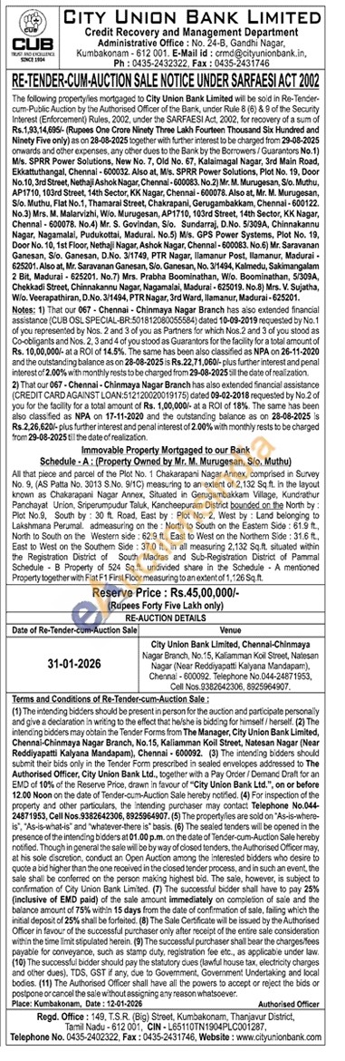 All that piece and parcel of the Plot No. 1 Chakarapani Nagar Annex, comprised in Survey No. 9, (AS Patta No. 3013 S.No. 9/1C) measuring to an extent of 2,132 Sq ft. in the layout known as Chakarapani Nagar Annex, Situated in Gerugambakkam Village, Kundrathur Panchayat Union, Sriperumpudur Taluk, Kancheepuram District bounded on the North by Plot No 9, South by: 30 ft. Road, East by Plot No. 2, West by Land belonging to Lakshmana Perumal admeasuring on the North to South on the Eastem Side: 61.9 North to South on the Western side: 62.5 East to West on the Nothern Side: 31.6 ft, East to West on the Southem Side 37.0 ft, in all measuring 2,132 Sq.ft. situated within the Registration District of South Madras and Sub-Registration District of Pammal Schedule B Property of 524 Sqft undivided share in the Schedule A mentioned Property together with Fat F1 First Floor measuring to an extent of 1,125 Soft