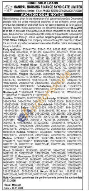 MANIPAL HOUSING FINANCE SYNDICATE LIMITED Gold Auctions Auction in Udupi