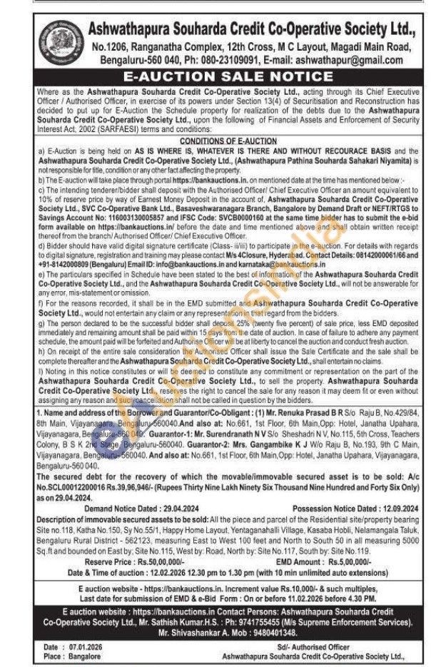 Description of immovable secured assets to be sold: All the piece and parcel of the Residential site/property bearing Site no. 118, Katha No. 150, Sy No.55/1, Happy Home Layout, Yentaganahalli Village, Kasaba Hobli, Nelamangala Taluk, Bengaluru Rural District-562123, measuring East to West 100 feet and North to South 50 in all measuring 5000 Sq.ft and bounded on East by: Site No. 115, West by: Road, North by: Site No. 117, South by: Site No. 119.