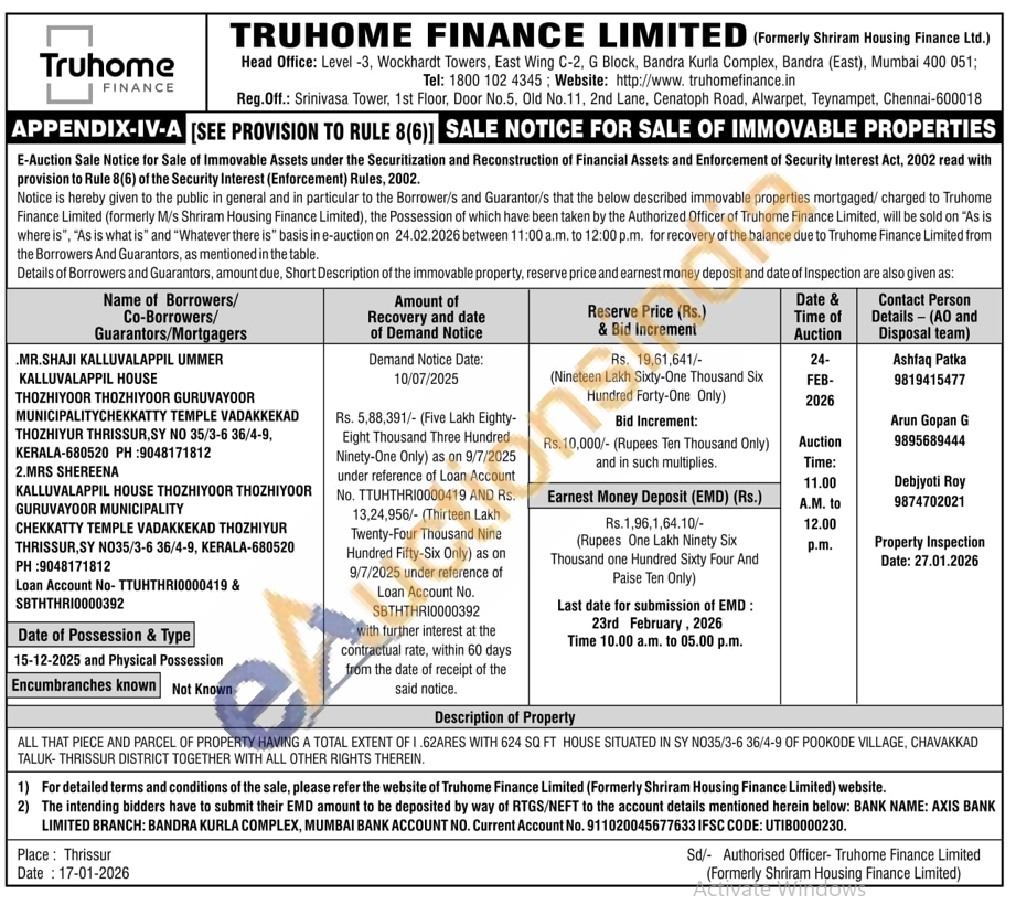ALL THAT PIECE AND PARCEL OF PROPERTY HAVING A TOTAL EXTENT OF 1.62ARES WITH 624 SQ FT HOUSE SITUATED IN SY NO35/3-6 36/4-9 OF POOKODE VILLAGE, CHAVAKKAD TALUK-THRISSUR DISTRICT TOGETHER WITH ALL OTHER RIGHTS THEREIN