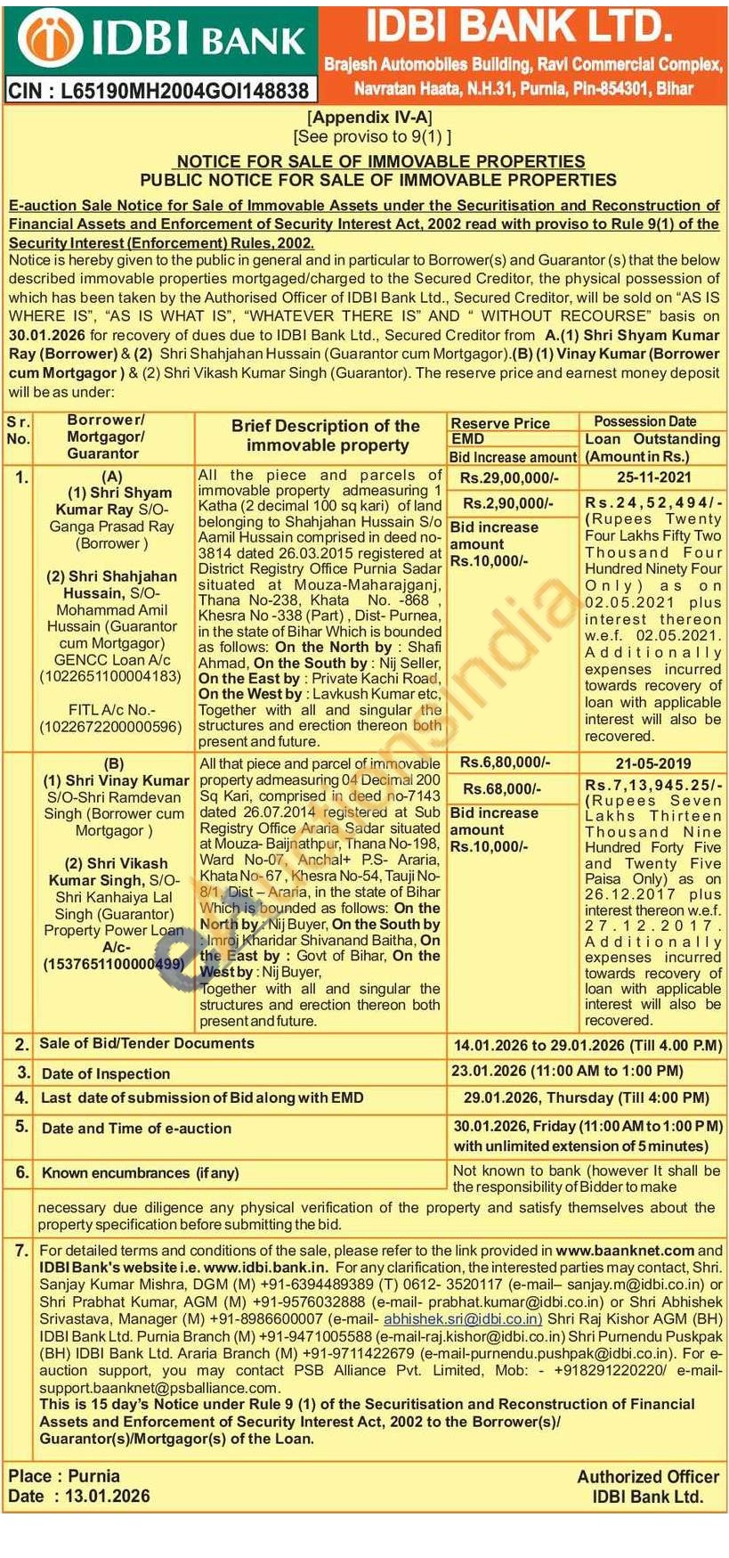 Sanjay Kumar Mishra :6394489389 (T) 0612-3520117 (e-mail-sanjay.m@idbi.co.in) or Shri Prabhat Kumar, 9576032888 (e-mail- prabhat kumar@idbi.co.in) or Shri Abhishek Srivastava, Manager (M) +91-8986600007 (e-mail- abhishek.sri@idbi.co.in)