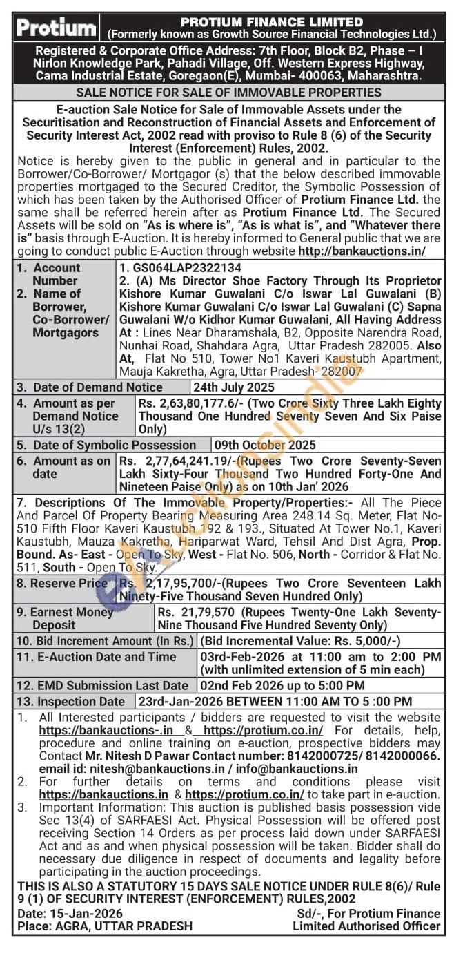 Descriptions Of The Immovable Property/Properties: All The Piece And Parcel Of Property Bearing Measuring Area 248.14 Sq. Meter, Flat No-510 Fifth Floor Kaveri Kaustubh 192 & 193., Situated At Tower No.1, Kaveri Kaustubh, Mauza Kakretha, Hariparwat Ward, Tehsil And Dist Agra, Prop. Bound. As- East - Open To Sky, West-Flat No. 506, North - Corridor & Flat No. 511, South- Open To Sky