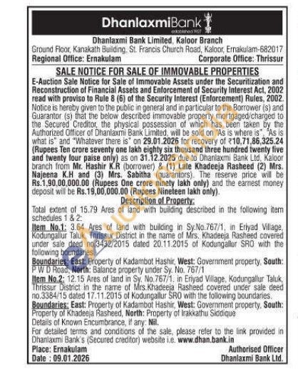 Total extent of 15.79 Ares of land with building described in the following item schedules 1 & 2 Item No.1: 3.54 Ares of land with building in Sy. No.767/1, in Erlyad Village, Kodungallur Taluk, Thrissur District in the name of Mrs. Khadeeja Rasheed covered under sale deed no.3432/2015 dated 20.11.2015 of Kodungallur SRO with the following boundaries. Boundaries: East: Property of Kadambot Hashir, West: Government property, South: PWD Road, North: Balance property under Sy. No. 767/1 Item No.2: 12.15 Ares of land in Sy. No. 767/1. in Eriyad Village, Kodungallur Taluk Thrissur District in the name of Mrs. Khadeeja Rasheed covered under sale deed no.3384/15 dated 17.11.2015 of Kodungallur SRO with the following boundaries. Boundaries: East: Property of Kadambot Hashir, West: Govemment property, South: Property of Khadeeja Rasheed, North: Property of Irakkathu Siddique Details of Known Encumbrance, If any. Nil,