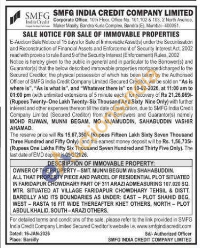 OWNER OF THE PROPERTY-SMT. MUNNI BEGUM W/O SHAHABUDDIN. ALL THAT PROPERTY PIECE AND PARCEL OF RESIDENTIAL PLOT SITUATED IN FARIDAPUR CHOWDHARY PART OF 311 ARAZI ADMEASURING 107.020 SQ. MTR. SITUATED AT VILLAGE FARIDAPUR CHOWDHARY TEHSIL & DISTT. BAREILLY AND ITS BOUNDARIES AS UNDER: EAST-PLOT SHAHID BEG, WEST-RASTA 16 FIT WIDE THEREAFTER KHET OTHERS, NORTH - PLOT ABDUL KHALID, SOUTH-ARAZI OTHERS.