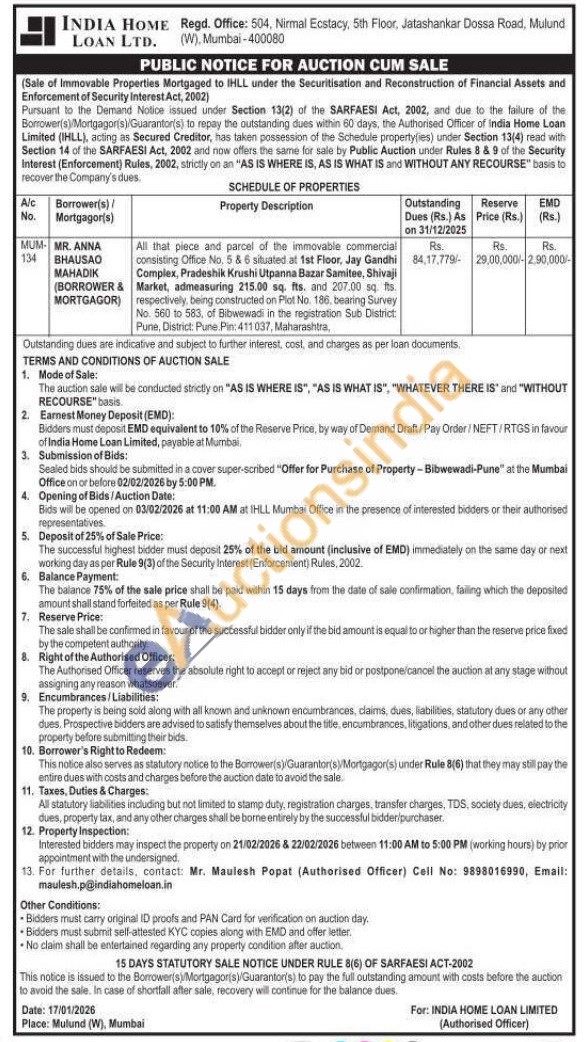 All that piece and parcel of the immovable commercial consisting Office No. 5 & 6 situated at 1st Floor, Jay Gandhi Complex, Pradeshik Krushi Utpanna Bazar Samitee, Shivaji Market, admeasuring 215.00 sq. fts. and 207.00 sq. fts. respectively, being constructed on Plot No. 186, bearing Survey No. 560 to 583, of Bibwewadi in the registration Sub District: Pune, District: Pune. Pin: 411037, Maharashtra