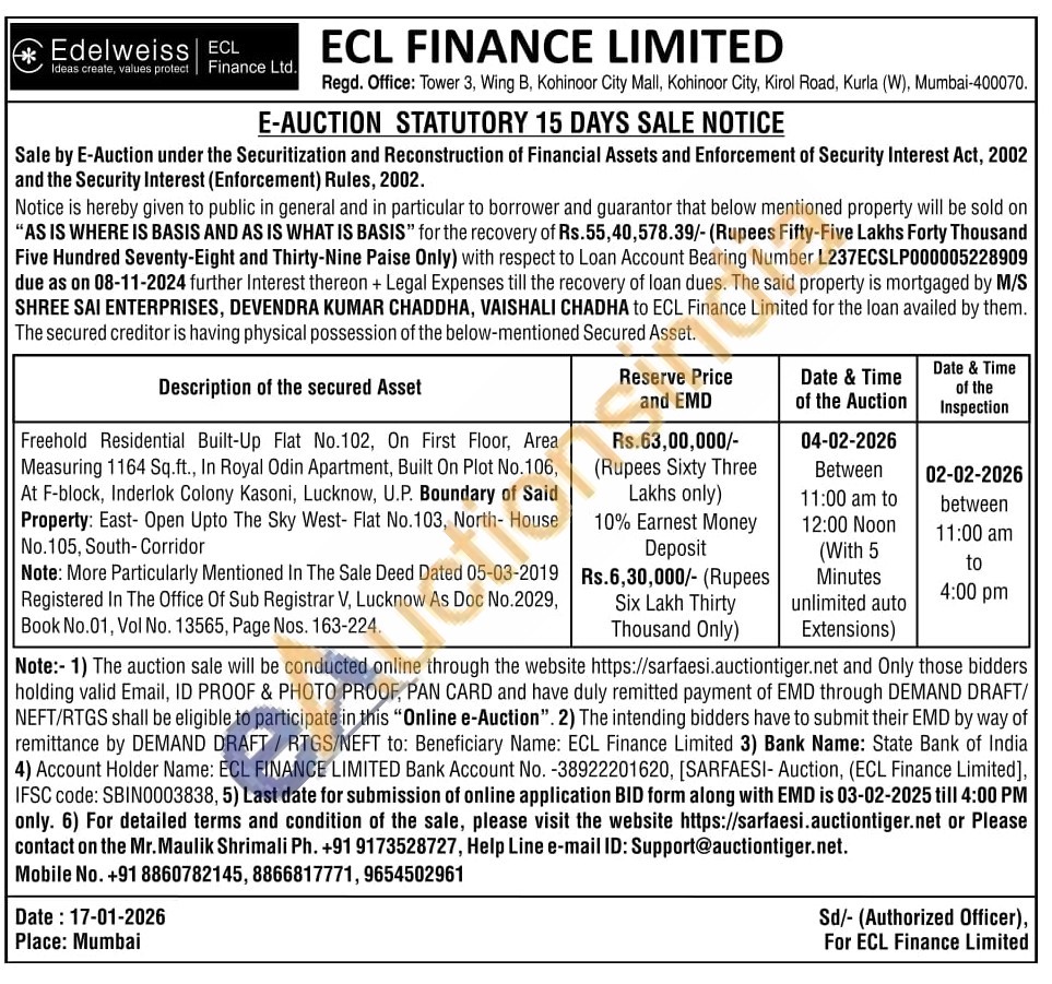 Freehold Residential Built-Up Flat No.102, On First Floor, Area Measuring 1164 Sq.ft., In Royal Odin Apartment, Built On Plot No.106, At F-block, Inderlok Colony Kasoni, Lucknow, U.P. Boundary of Said Property: East- Open Upto The Sky West- Flat No.103, North- House No. 105, South-Corridor Note: More Particularly Mentioned In The Sale Deed Dated 05-03-2019 Registered In The Office Of Sub Registrar V, Lucknow As Doc No.2029, Book No.01, Vol No. 13565, Page Nos. 163-224