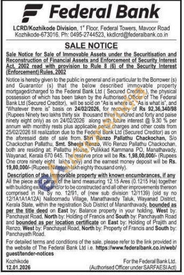 Description of the immovable property with known encumbrances, if any All the piece and parcel of the land measuring 12. 15 Ares (0.1215 Ha) together with building existing and/or to be constructed and all other improvements thereon comprised in Re Sy no. 12/91, of (new sub division 12/1139) (old sy no 12/1A1A1A12A) Nalloomadu Village, Manathavady Taluk, Wayanad District Kerala State, within the registration Sub District of Mananthavady, bounded as per the title deed on East by: Balance property in your holding, West by. Panchayat Road, North by: Holding of Francis and South by: Panchayath Road and bounded as per location certificate on East by. Hoiding of Prajith and Renzo, West by: Panchayat Road, North by: Property of Francis and South by: Panchayath Road