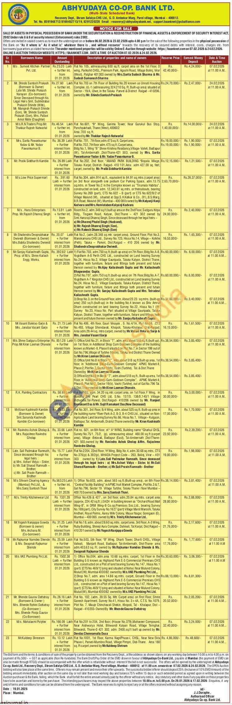 Contact Tel. No. 8591948712/8169452713/19, 8291220220 Email: recovery@abhyudayabank.net, support baanknet@psballiance.com