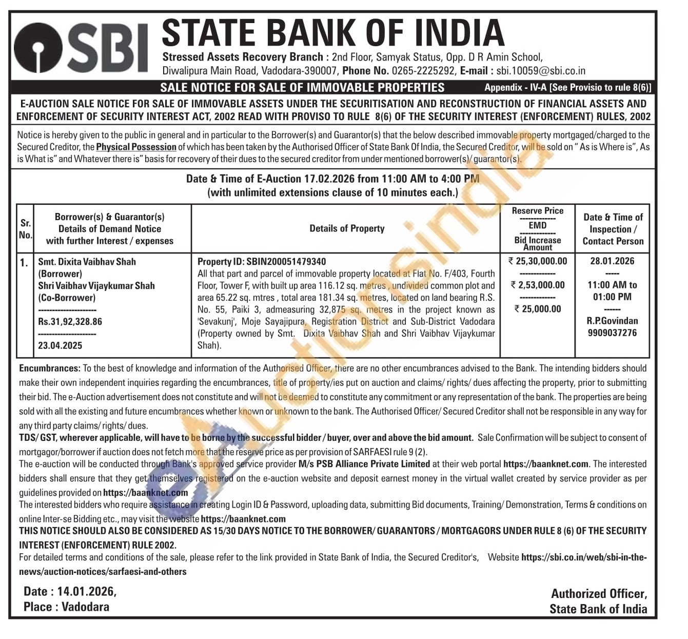 All that part and parcel of immovable property located at Flat No. F/403, Fourth Floor, Tower F, with built up area 116.12 sq. metres, undivided common plot and area 65.22 sq. mtres, total area 181.34 sq. metres, located on land bearing R.S. No. 55, Paiki 3, admeasuring 32,875 sq. metres in the project known as 'Sevakunj', Moje Sayajipura, Registration District and Sub-District Vadodara (Property owned by Smt. Dixita Vaibhav Shah and Shri Vaibhav Vijaykumar Shah).