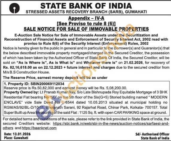 Property Owned by: Lt Pranab Kumar Ray, S/o Late Bishnupada Roy Equitable Mortgage of 3 BHK Residential Flat bearing No "5D" on the 5th floor of the Six(G+5) Storied building named "MODERN ENCLAVE" vide Sale Deed No: 6544 dated 10.05.2013 situated at municipal holding no RGM/AS/92/BL-D/10-11, Bholanath Sarani, 92 Rajarhat Road, Chinar Park, Kolkata- 700157. Total Super Built up Area Measuring of the said Flat: 1125 Sq. ft. with open CAR PARKING space at ground.