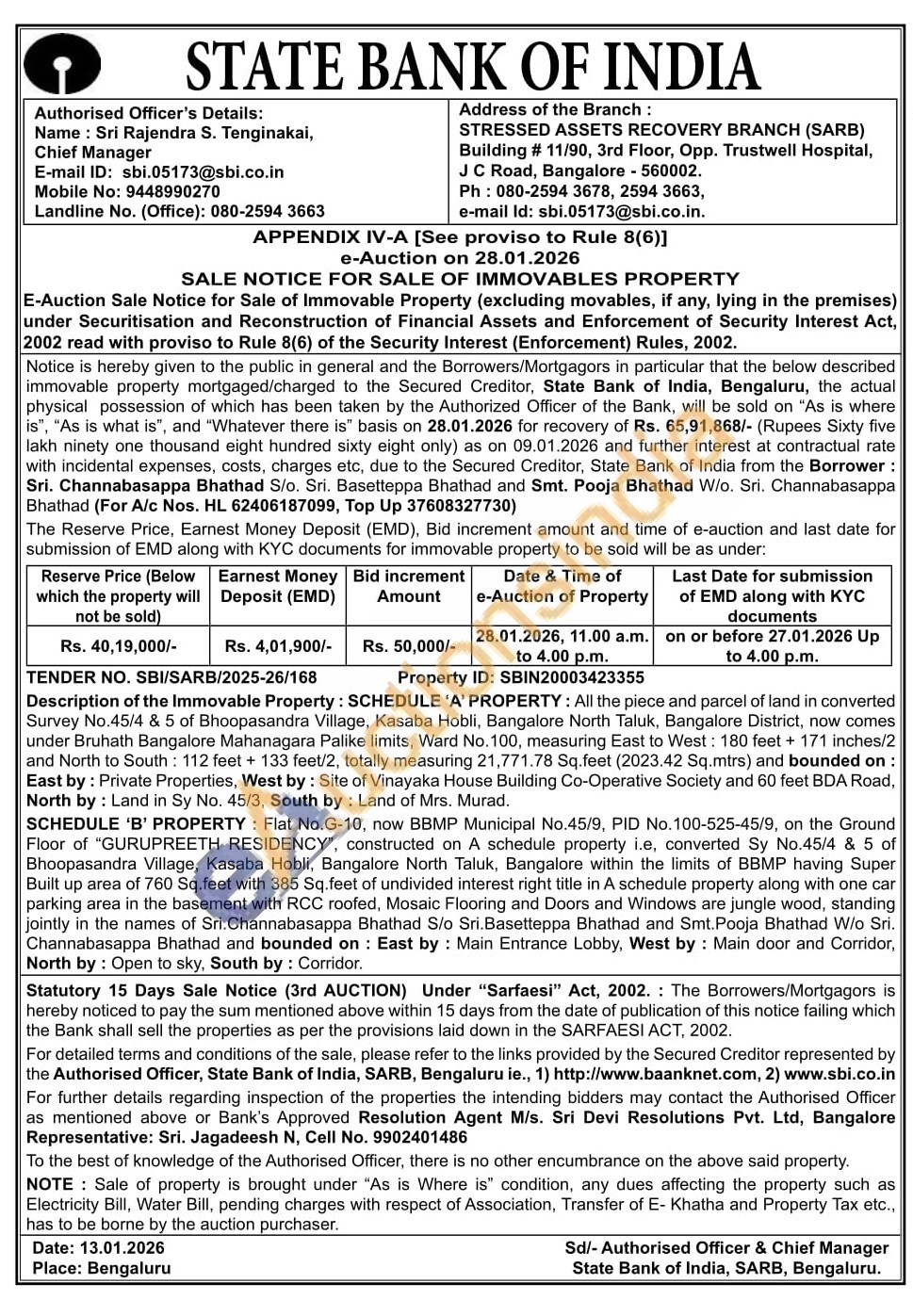 Description of the Immovable Property: SCHEDULE 'A' PROPERTY: All the piece and parcel of land in converted Survey No.45/4 & 5 of Bhoopasandra Village, Kasaba Hobli, Bangalore North Taluk, Bangalore District, now comes under Bruhath Bangalore Mahanagara Palike limits, Ward No. 100, measuring East to West: 180 feet + 171 inches/2 and North to South: 112 feet + 133 feet/2, totally measuring 21,771.78 Sq.feet (2023.42 Sq.mtrs) and bounded on: East by: Private Properties, West by: Site of Vinayaka House Building Co-Operative Society and 60 feet BDA Road, North by: Land in Sy No. 45/3, South by: Land of Mrs. Murad. SCHEDULE 'B' PROPERTY: Flat No.G-10, now BBMP Municipal No.45/9, PID No. 100-525-45/9, on the Ground Floor of "GURUPREETH RESIDENCY", constructed on A schedule property i.e, converted Sy No.45/4 & 5 of Bhoopasandra Village, Kasaba Hobli, Bangalore North Taluk, Bangalore within the limits of BBMP having Super Built up area of 760 Sq.feet with 385 Sq.feet of undivided interest right title in A schedule property along with one car parking area in the basement with RCC roofed, Mosaic Flooring and Doors and Windows are jungle wood, standing jointly in the names of Sri.Channabasappa Bhathad S/o Sri.Basetteppa Bhathad and Smt. Pooja Bhathad W/o Sri. Channabasappa Bhathad and bounded on: East by: Main Entrance Lobby, West by: Main door and Corridor, North by: Open to sky, South by: Corridor