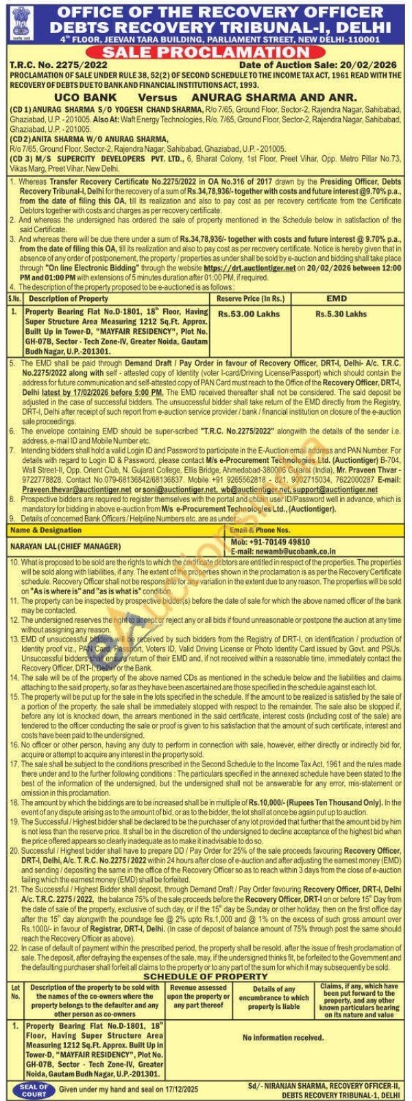 Property Bearing Flat No.D-1801, 18" Floor, Having Super Structure Area Measuring 1212 Sq.Ft. Approx. Built Up in Tower-D, "MAYFAIR RESIDENCY", Plot No. GH-07B, Sector-Tech Zone-IV, Greater Noida, Gautam Budh Nagar, U.P.-201301