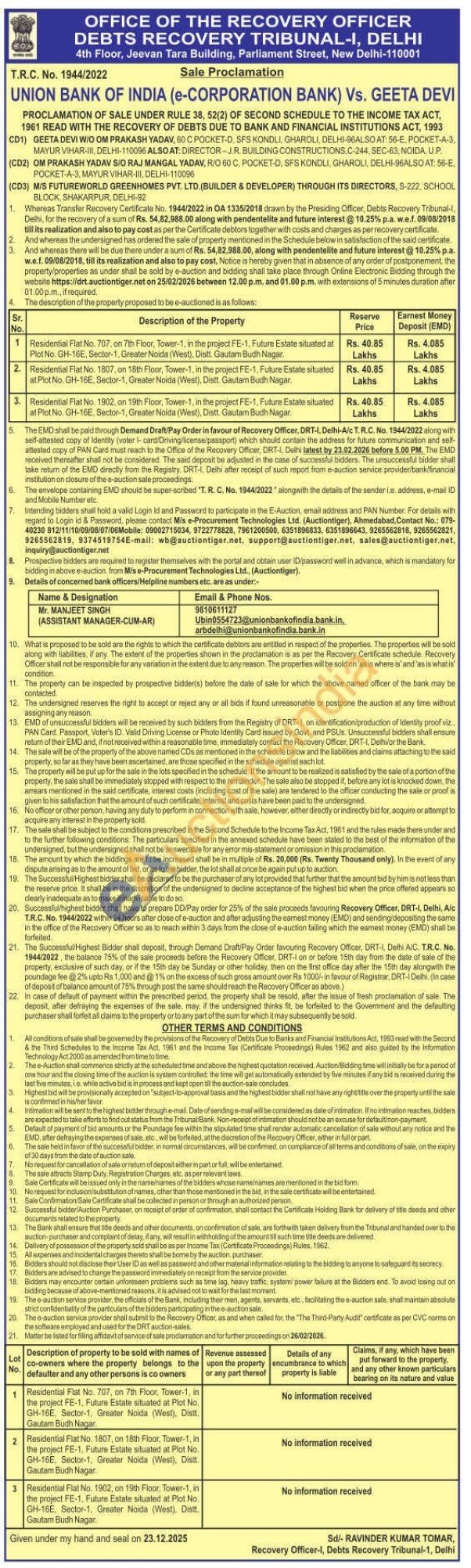 Residential Flat No. 1807, on 18th Floor, Tower-1, in the project FE-1, Future Estate situated at Plot No. GH-16E, Sector-1, Greater Noida (West), Distt. Gautam Budh Nagar