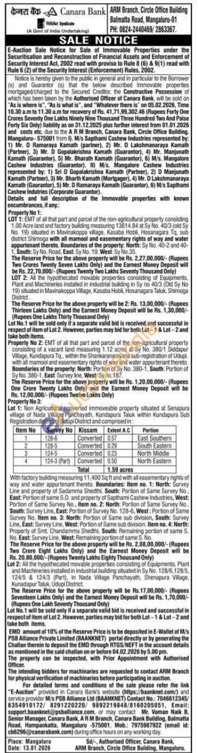 Details and full description of the Immovable property with known encumbrances, if any: Property No 1: LOT 1: EMT of all that part and parcel of the non-agricultural property consisting 1.00 Acre land and factory building measuring 13614.84 at Sy No. 40/3 (old Sy No. 19) situated in Mavinakoppa village, Kasaba Hobli, Hosanagara Tq, sub district Shimoga with all mamool and easementary rights of way and water appurtenant thereto. Boundaries of the property: North: Sy No. 40-2 and 40-1. South: Sy No. Road, East: Sy No. 19. West: Sy No.35